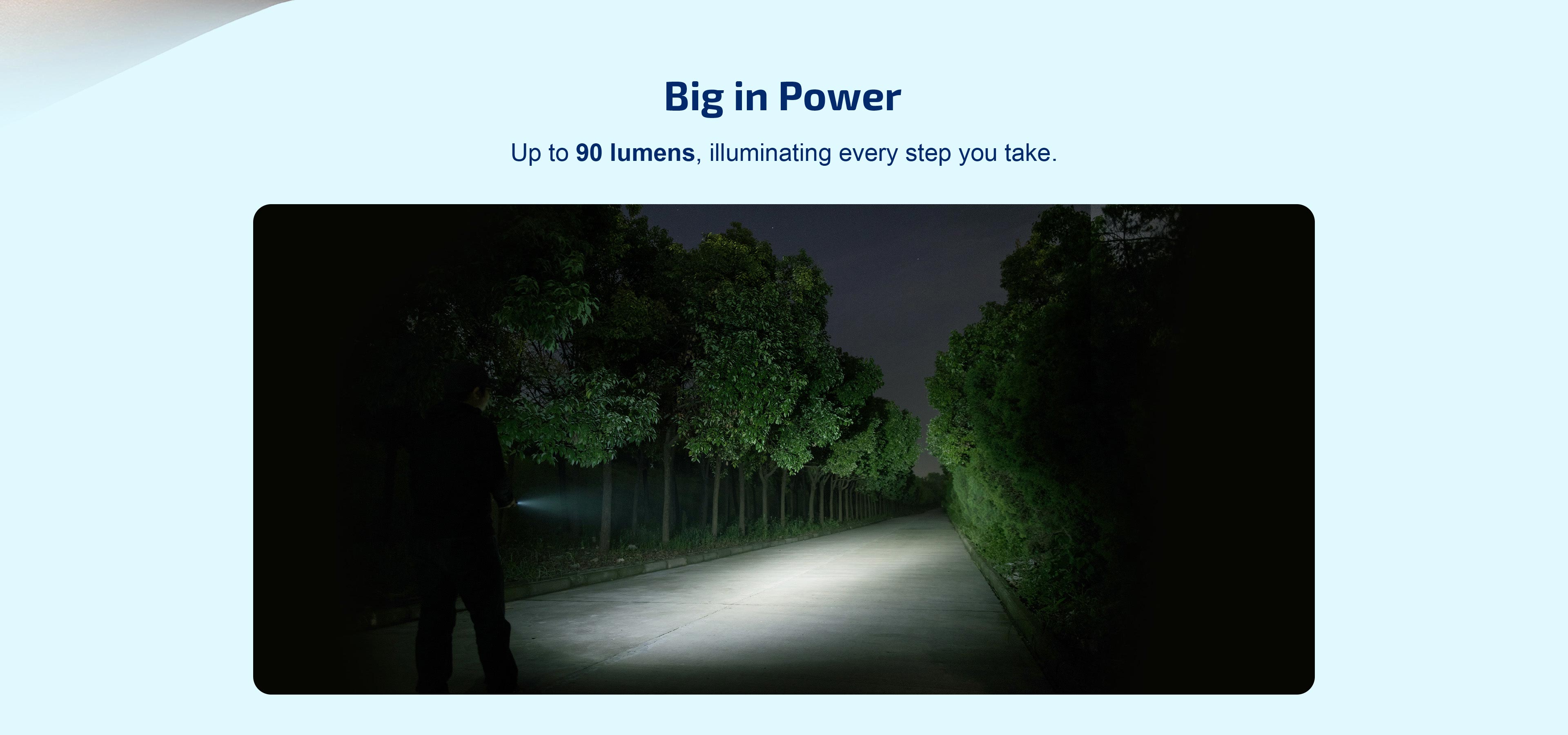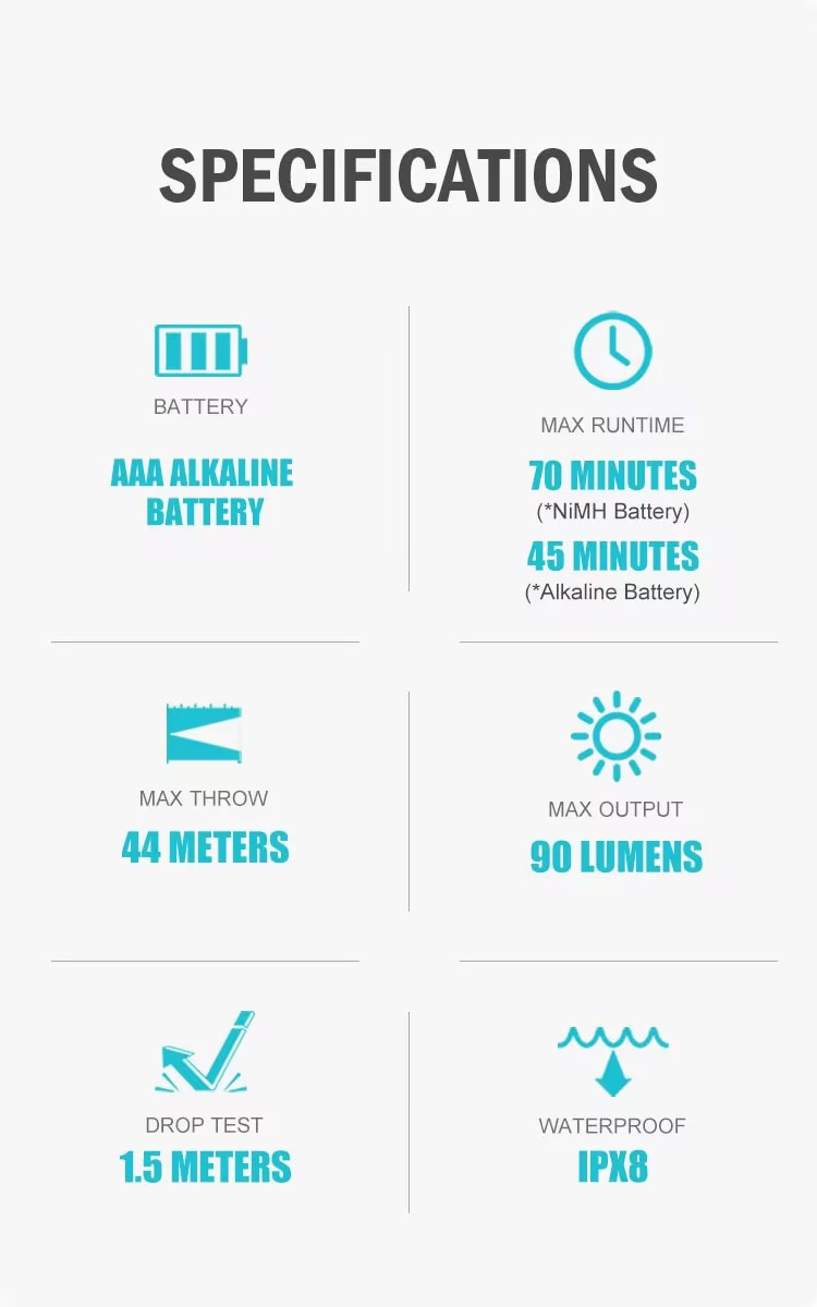 Easy Activation: Simple head twist to activate with 90 lumens with machining for optimal grip. AAA Battery: Powered by a single widely available AAA battery. Incredible Performance: Features a high-performance Philips LUXEON TX LED and a PMMA TIR lens that focuses the light to reach out up to 44 meters. Mini Size: As small as your pinky finger, weighing in only 0.68oz, measuring in 2.38in.